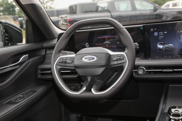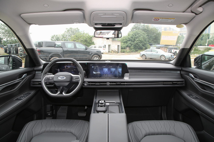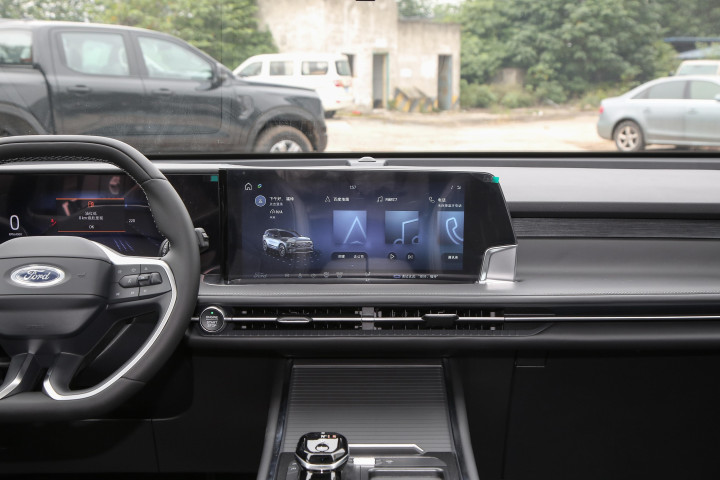 来到福特锐界L的车内,整体采用T型中控布局,视觉上最吸引人的无疑是那块27英寸的贯穿式大屏。它支持分屏操作,驾驶者可以查看导航的同时,副驾乘客还能观看视频,对于家庭出行场景来说,实用且贴心。不过,由于大部分功能都被整合进屏幕,车内仅保留了调节空调和音量的少数物理按键。整体风格虽然简洁现代,但在行车过程中想要快速调整温度或风量,仍需在屏幕中寻找对应功能,不如实体按键来得直接顺手。